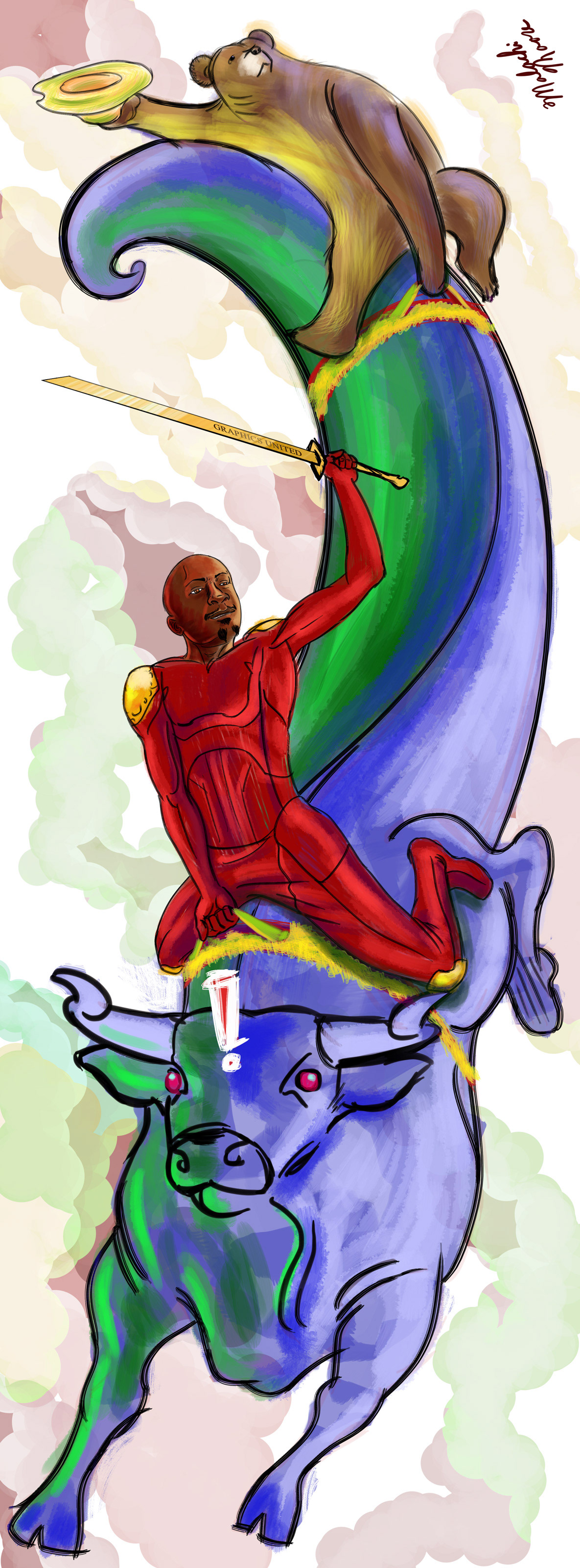 The servant suits up in his red suit to do some bull wranglin'...with a random bear pal.